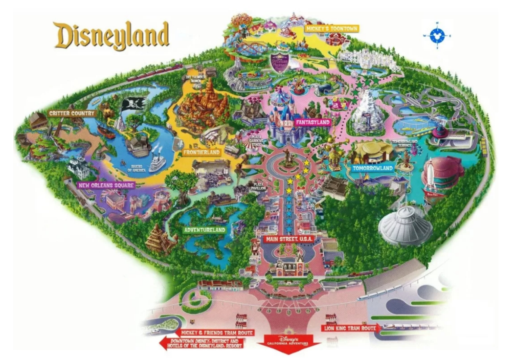 加州迪士尼樂(lè)園最早的分區(qū)為:美國(guó)大街、探險(xiǎn)世界、幻想世界、明日世界、邊域世界、動(dòng)物天地、米奇卡通城、新奧爾良廣場(chǎng)。后續(xù)興建的迪士尼樂(lè)園基本是在這個(gè)分區(qū)的思路下引申。